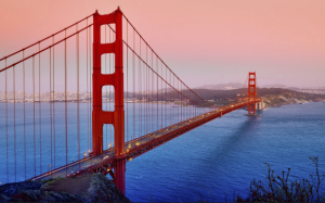 The Golden Gate Bridge joins San Francisco and Marin County. It is red in color and when it contrasts with the blue water, it gives an aesthetic feel to the city.