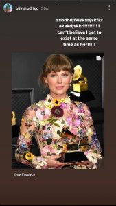 Taylor Swift won ‘Album of the Year’ at the Grammys for the third time last night, for her album ‘Folklore’; creating a record at the prestigious awards. While the whole music community has been proud of her and showering her with love, Olivia Rodrigo took to Instagram to share this news on her story, her words signifying the rapture she’s experiencing. Here’s her story: