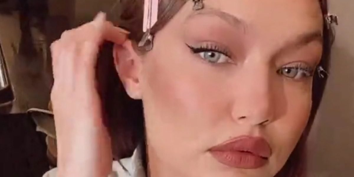 In the video, Gigi in her robe is showing her hair-clips and make-up. We hear some background chatter. Before closing, she winks and lets out a very hearty smile towards the camera.