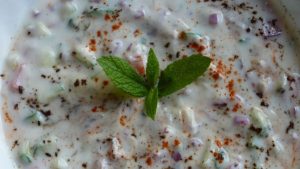 Raita is a traditional Indian side dish comprised of dahi (yogurt/curd) with raw or cooked vegetables.