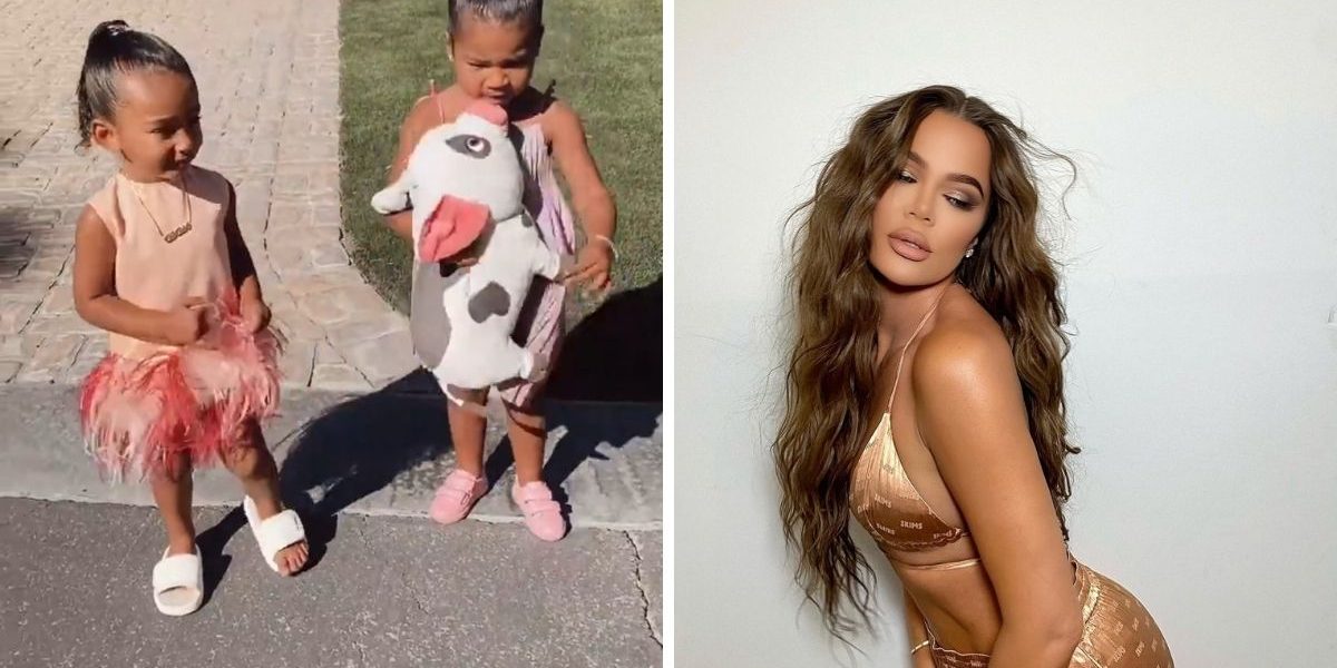 In the snippet shared by the reality tv star, we can see True Thompson in an orange tint flowy dress having a say with her friend. The little munchkin looked adorably cute with her little matching orange shoes and tied-up hairdo. True was seen standing in the front of their backyard with her friend who was in a colorful light purple attire holding a large stuffed bunny.