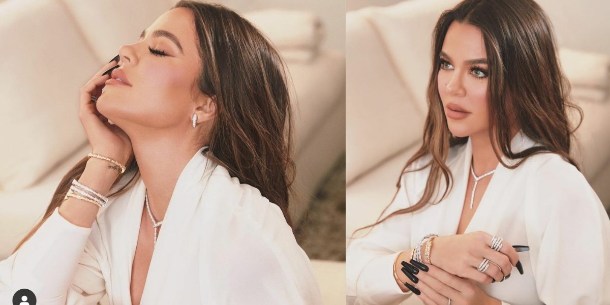 Khloe looks mesmerizing in an all-white suit with matching diamond jewelry pieces in free brown locks and black acrylic nails.