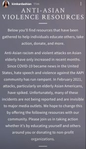 Kardashian took to Instagram to post stories speaking up against the violence. She also posted screenshots of some tweets where people have used the hashtag #PROTECTASIANLIVES and narrated their stories of being an immigrant to the States from Asia and the discrimination faced by them.
