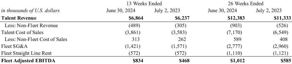 The Company also uses Fleet Adjusted EBITDA to evaluate the performance of its MiniLuxe Core Studio business (19 MiniLuxe-branded studios operating for 18+ months). This metric is calculated in a similar manner, starting with Talent revenue and adjusting for non-fleet Talent revenue and cost of sales, further adjusted by fleet general and administrative expenses and finally subtracting straight line rent expense (similar to amount used in the full company Adjusted EBITDA, less amounts allocated to locations outside of MiniLuxe’s core studio business, i.e. Paintbox). The Company believes that this metric most closely mirrors how management views the fleet portion of the business. A reconciliation of Talent revenue to Fleet Adjusted EBITDA is included in Selected Consolidated Financial Information.