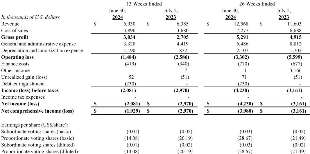 The following table outlines the consolidated statements of loss and comprehensive loss for the thirteen and 26 weeks ended June 30, 2024 and July 2, 2023: