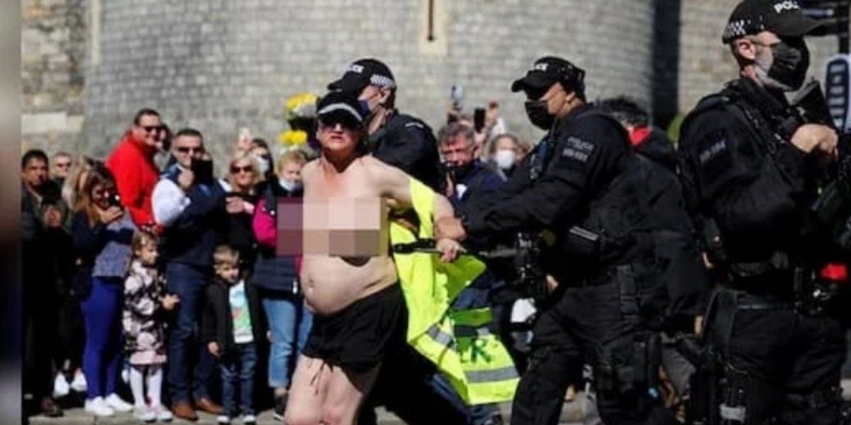 During the ceremonial royal funeral of Prince Philip at St. George’s Chapel, a topless woman was arrested for creating commotion on the streets of Windsor.